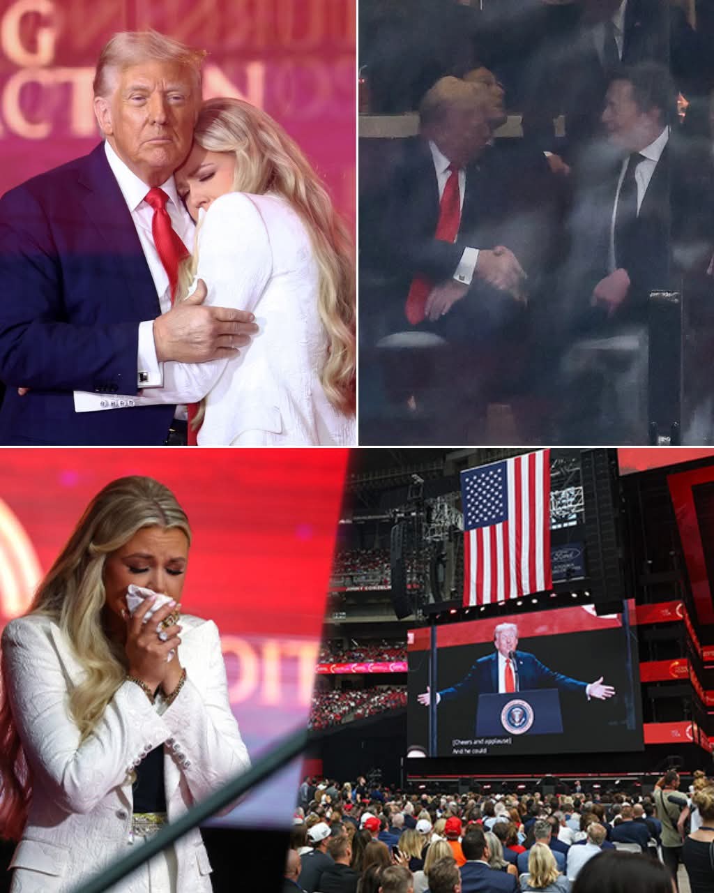 Charlie Kirk’s widow, visibly trembling, had stepped forward with her final words. They were not meant for the nation, but for her husband — broken sentences, a confession of love, loss, and an unshakable faith. The crowd held its breath, thousands of phones raised, but just as she turned, history bent in an unexpected way. She walked straight into President Donald Trump’s arms. The stadium roared, yet behind the noise, something else happened — something America hasn’t yet seen.