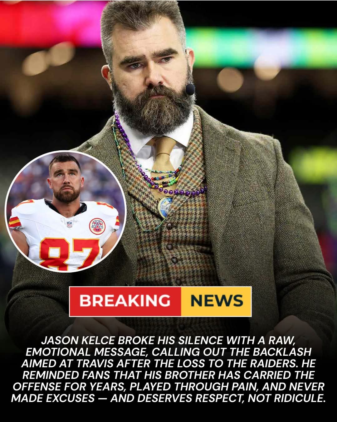 🔥 JASON KELCE SPEAKS OUT: Jason Kelce Defends His Brother Travis Kelce After the Loss — “This Isn’t Just Criticism. It’s an Insult to Football.” Jason Kelce broke his silence with a raw, emotional message, calling out the backlash aimed at Travis after the loss to the Raiders. He reminded fans that his brother has carried the offense for years, played through pain, and never made excuses —