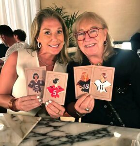 The cards Donna held up showed a drawing of a woman wearing a white Cleveland Heights High School football jersey with the No. 11 and of another woman wearing a University of Cincinnati jersey with the No. 18.
